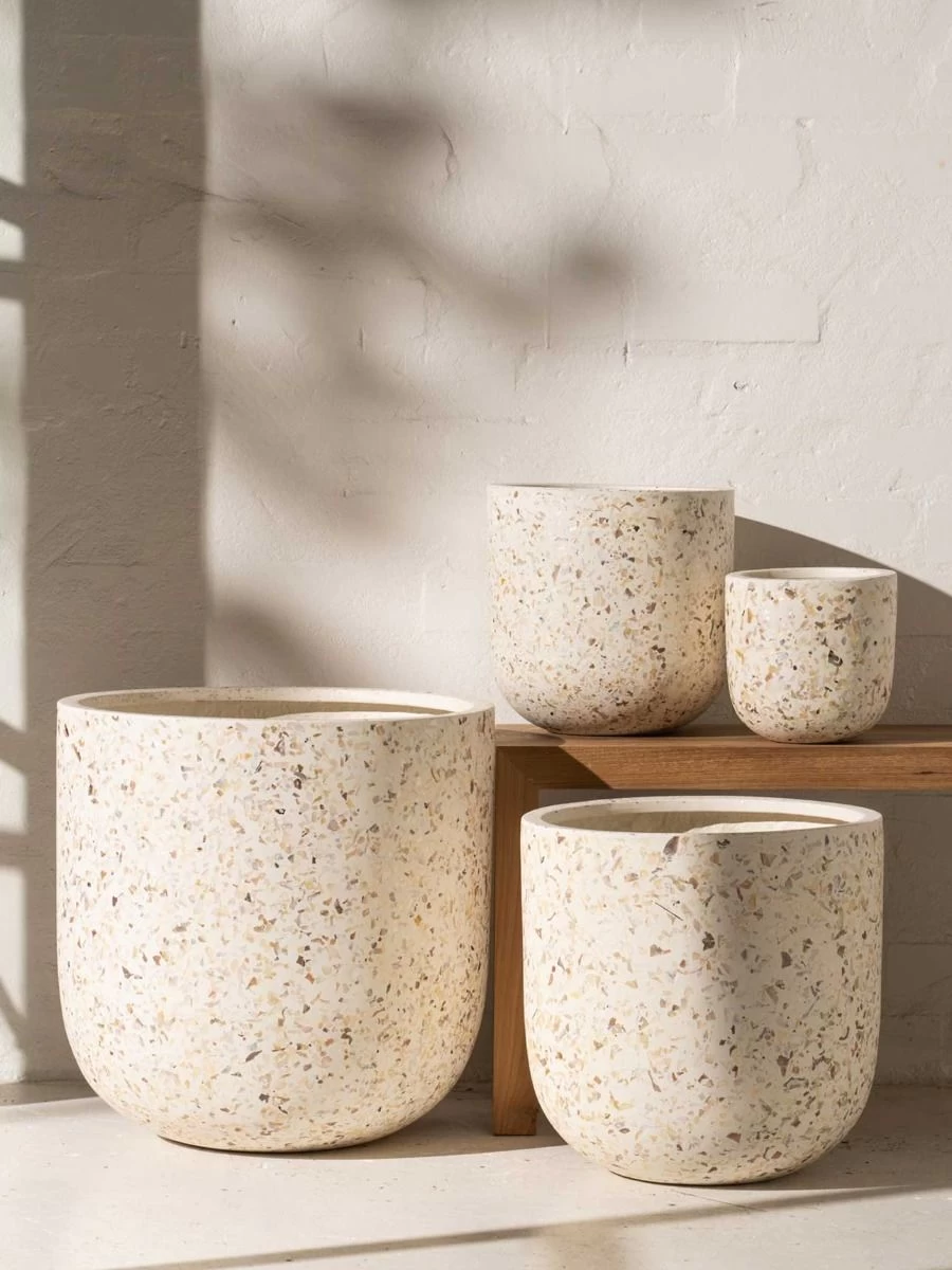 Reduce environmental impact with the Inken eco-friendly fibrestone pots featuring a natural shell surface. Crafted with a lightweight fibrestone base and adorned with a natural shell surface, these pots feature a stunning textural finish. Ideal for indoor/outdoor use with a drainage hole.