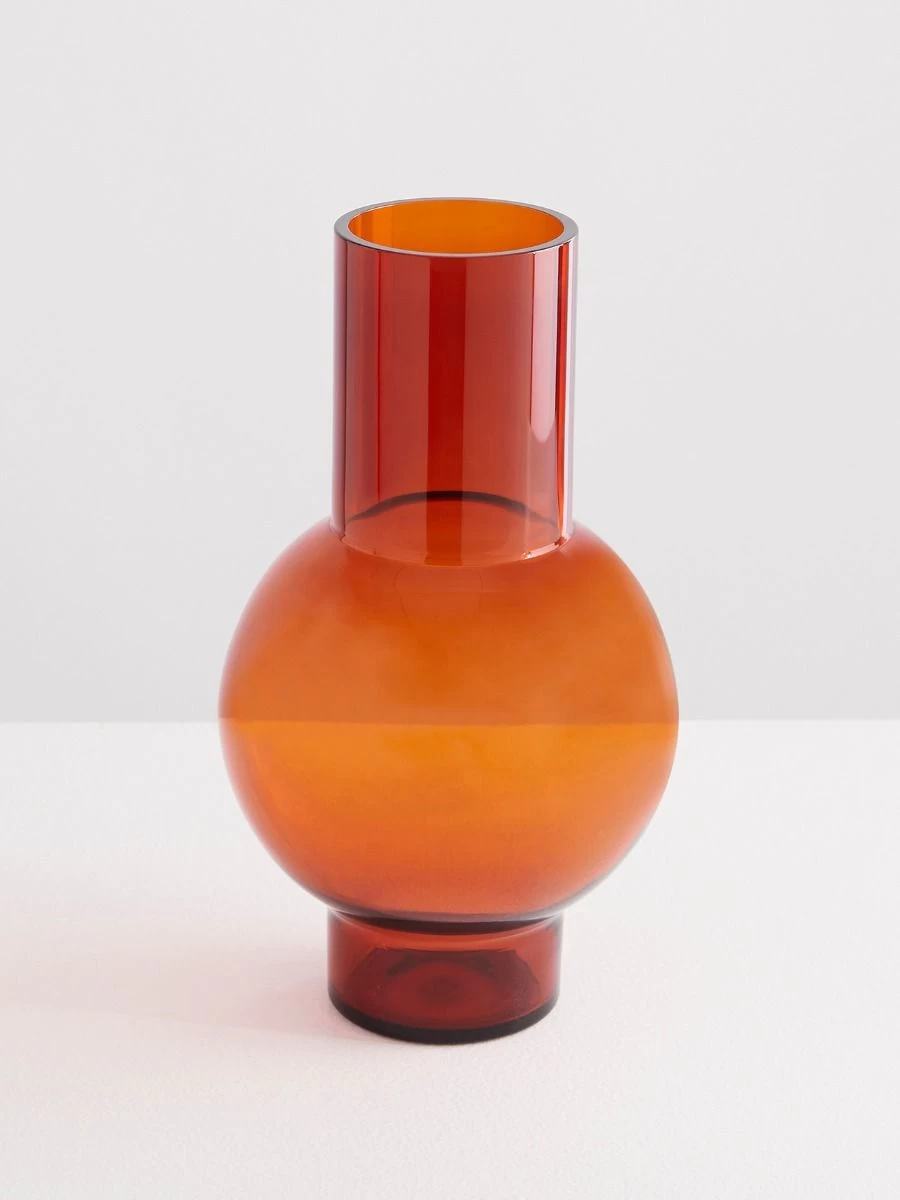 Our beacon of light, the Loulou XL vase is all grown up and dressed in a demure amber borosilicate glass. Still playful at heart, she invites you to see how many flowers can float within her buoyed bowl.