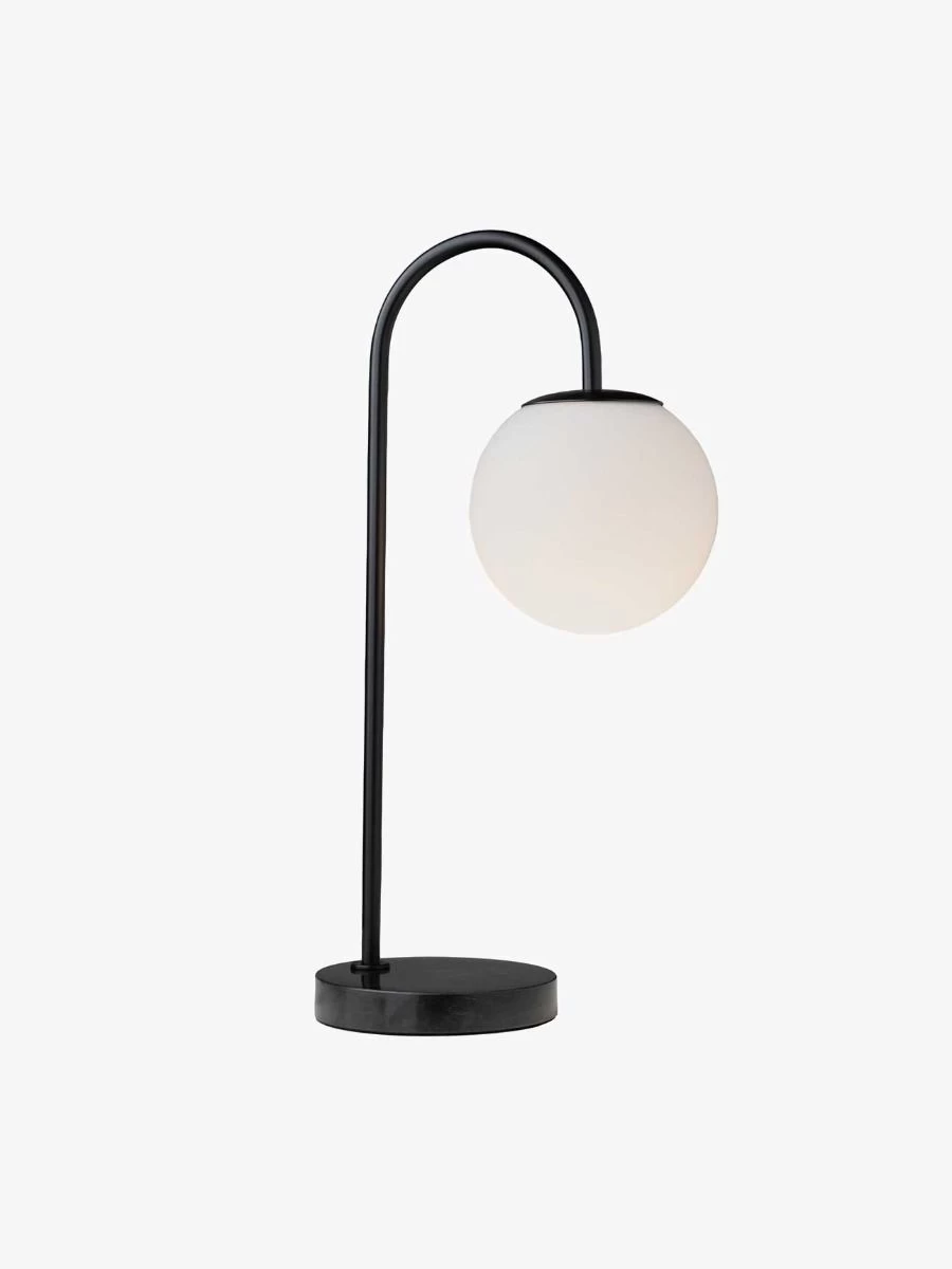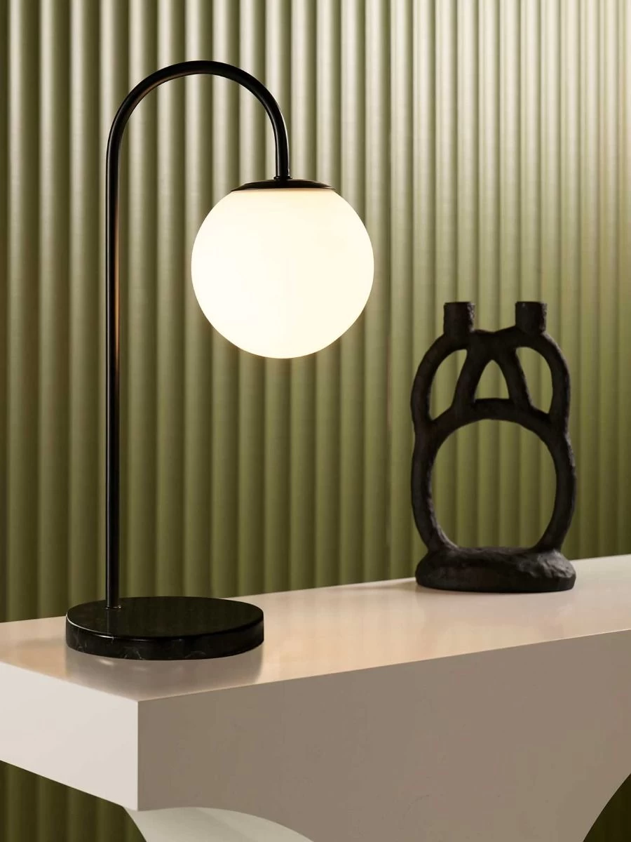 Experience modern aesthetics with the Mintu Desk Lamp. Its curved base combines black marble and metal, supporting a frosted glass globe that radiates gentle illumination from every angle. Perfectly enhance living rooms and bedrooms with this stylish lighting solution.