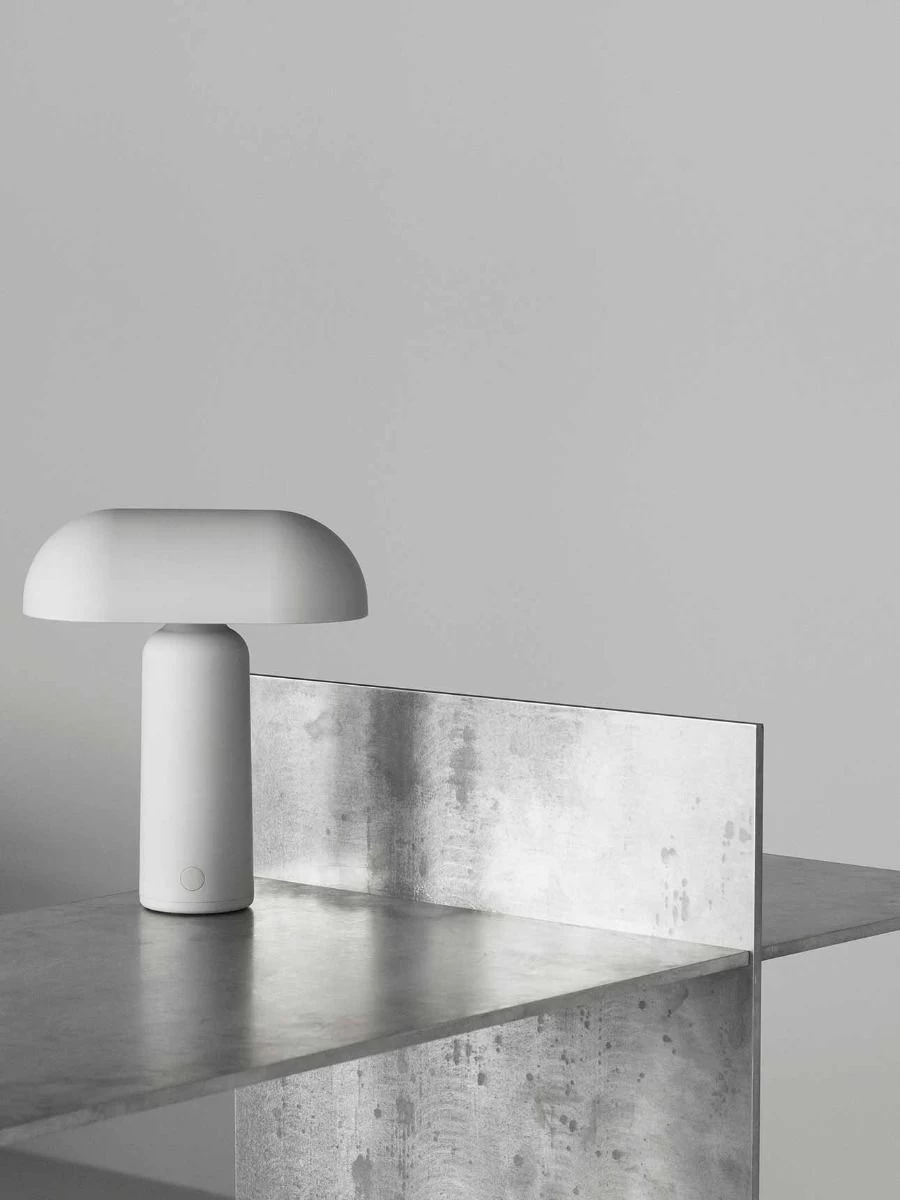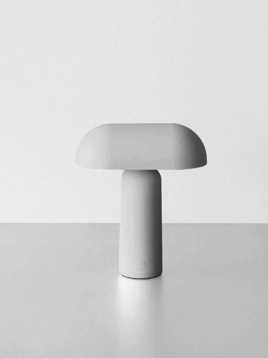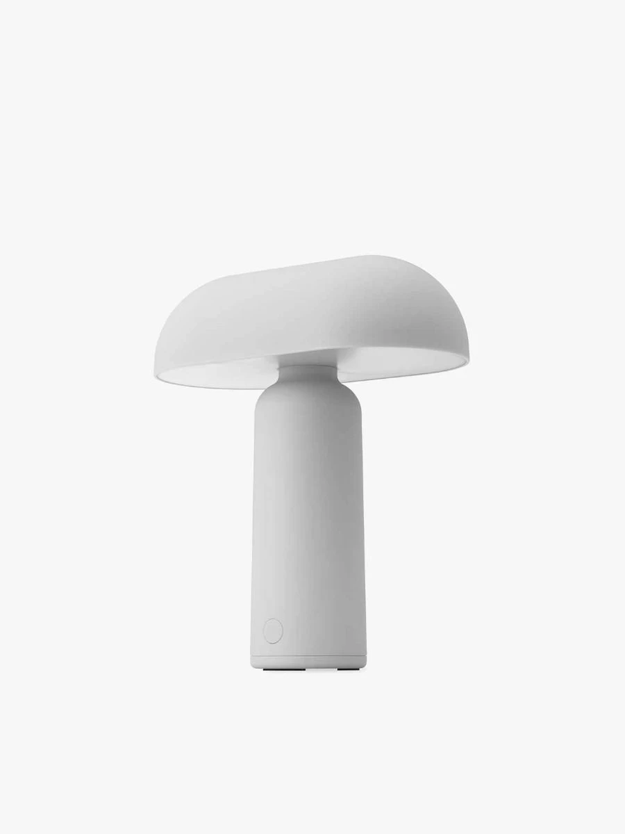 As implied by its name, Porta is the first portable lamp in the Normann Copenhagen lighting collection. Characterized by its rounded, organic design cues, the cylinder base and elongated dome shape of the lamp shade contribute to an aesthetic cohesiveness. The distinctive lamp shade is designed to accommodate the need for pleasant, atmospheric lighting in smaller settings. When turned at a 90-degree angle, the lamp shade takes up less space, allowing it to easily fit into compact spaces such as windowsills, small café tables, or shelves.