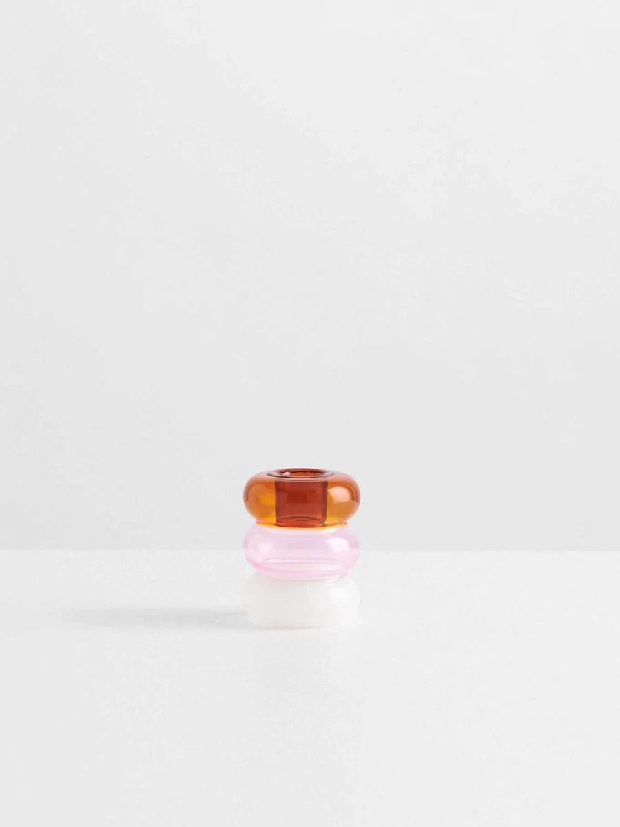 Petite Pauline is a playful stack of amber, pink and white glass bubbles. All it needs it a candle to complete its airy silhouette! This candle holder doubles as a lucky charm, so we recommend making a wish before you light the candle that will sit on top!