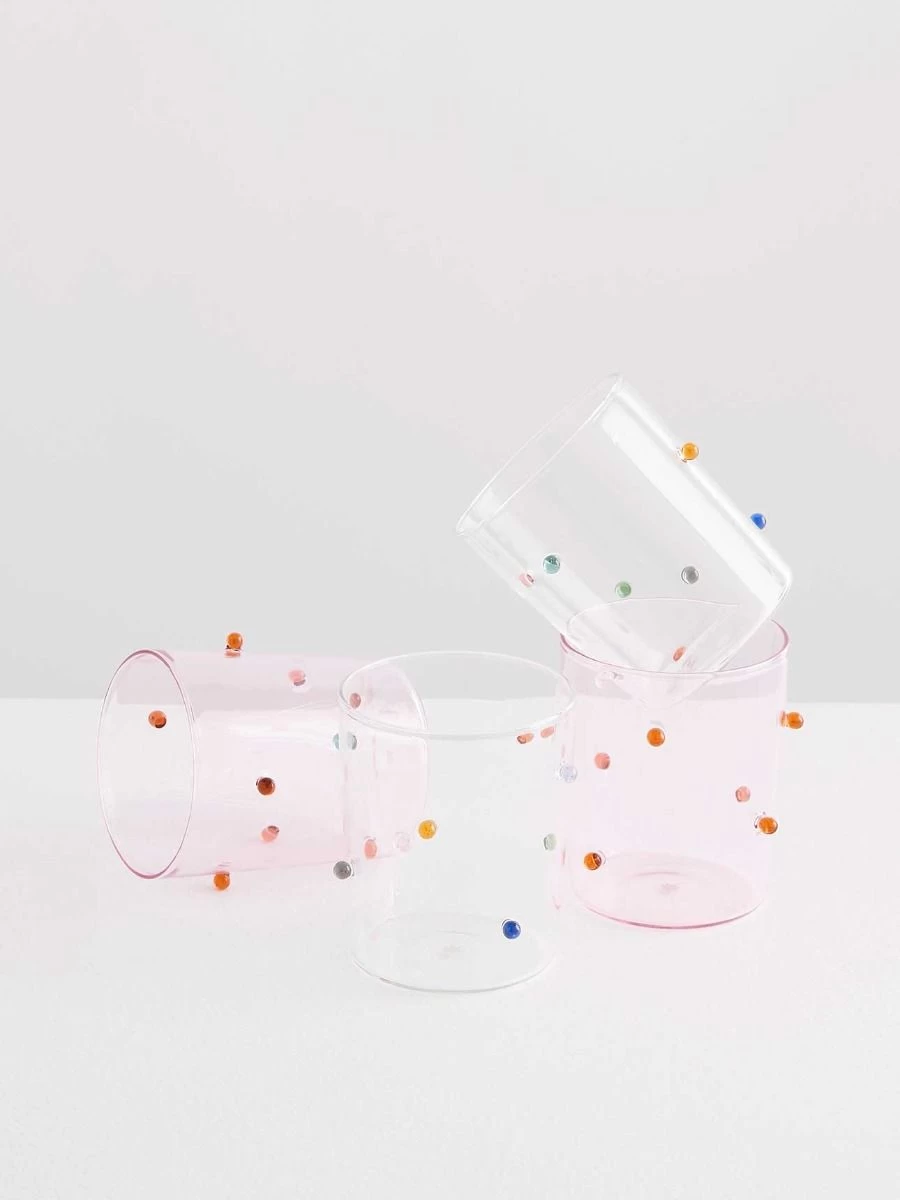These two drinking tumblers are each handcrafted in clear borosilicate glass and adorned with floating colourful ball. Each colourful pomponette playfully mimicks the effervescent dance of our favourite fizzy drinks as the bubbles leap to and fro. No matter what you sip, these glasses are sure to add some fun to your sipping experience!