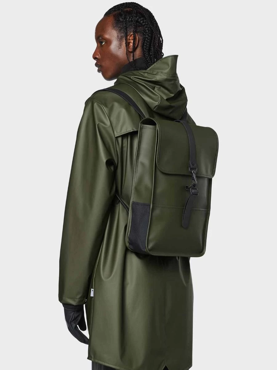 Backpack Mini is a downscaled version of Backpack, a true Rains classic. The silhouette is characterized by its prominent flap and central strap with carabiner closure. This clean and ever contemporary waterproof rucksack features an internal laptop pocket, a main compartment, and a concealed external phone pocket on the back panel.